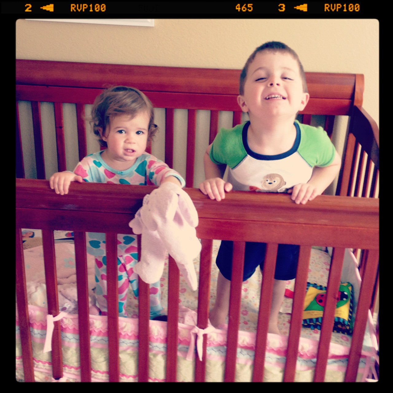 | Every morning I go get Audrey, Luke runs in before me and gets in the crib with her. When I turned the corner, they both jump up and down, and think it is hilarious! |